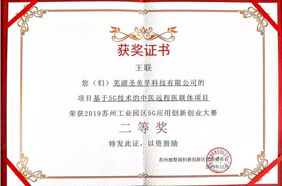 蕪湖圣美孚科技公司以“基于5G技術的中醫(yī)遠程醫(yī)聯(lián)體項目”參加此次大賽,與參賽的各種人工智能、大數(shù)據(jù)和物聯(lián)網(wǎng)等5G示范應用場景的高新科技項目同臺亮相,于決賽現(xiàn)場進行了路演,闡述了基于5G技術的中醫(yī)遠程醫(yī)聯(lián)體項目成果并接受大賽評委的評審問答,經(jīng)過一番角逐,我公司參賽的“基于5G技術的中醫(yī)遠程醫(yī)聯(lián)體項目”榮獲2019年蘇州工業(yè)園區(qū)5G應用創(chuàng)新創(chuàng)業(yè)大賽二等獎。